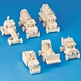 Model trucks, bulldozers and more. Includes 40-75 pieces per model. Unassembled and unfinished. 1-1/2" to 2"W x 1-3/4" to 3"H x 3" to 6-1/2"L.